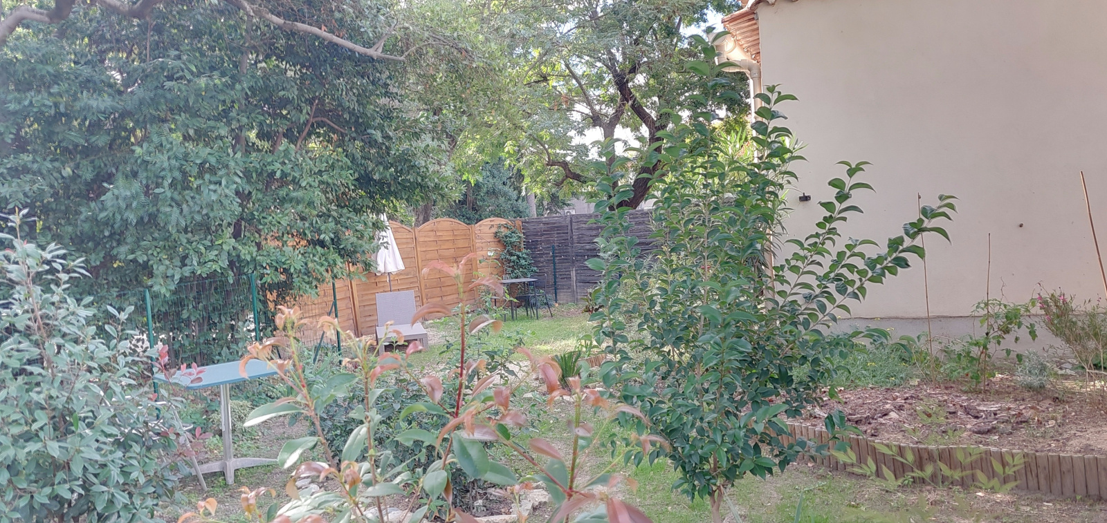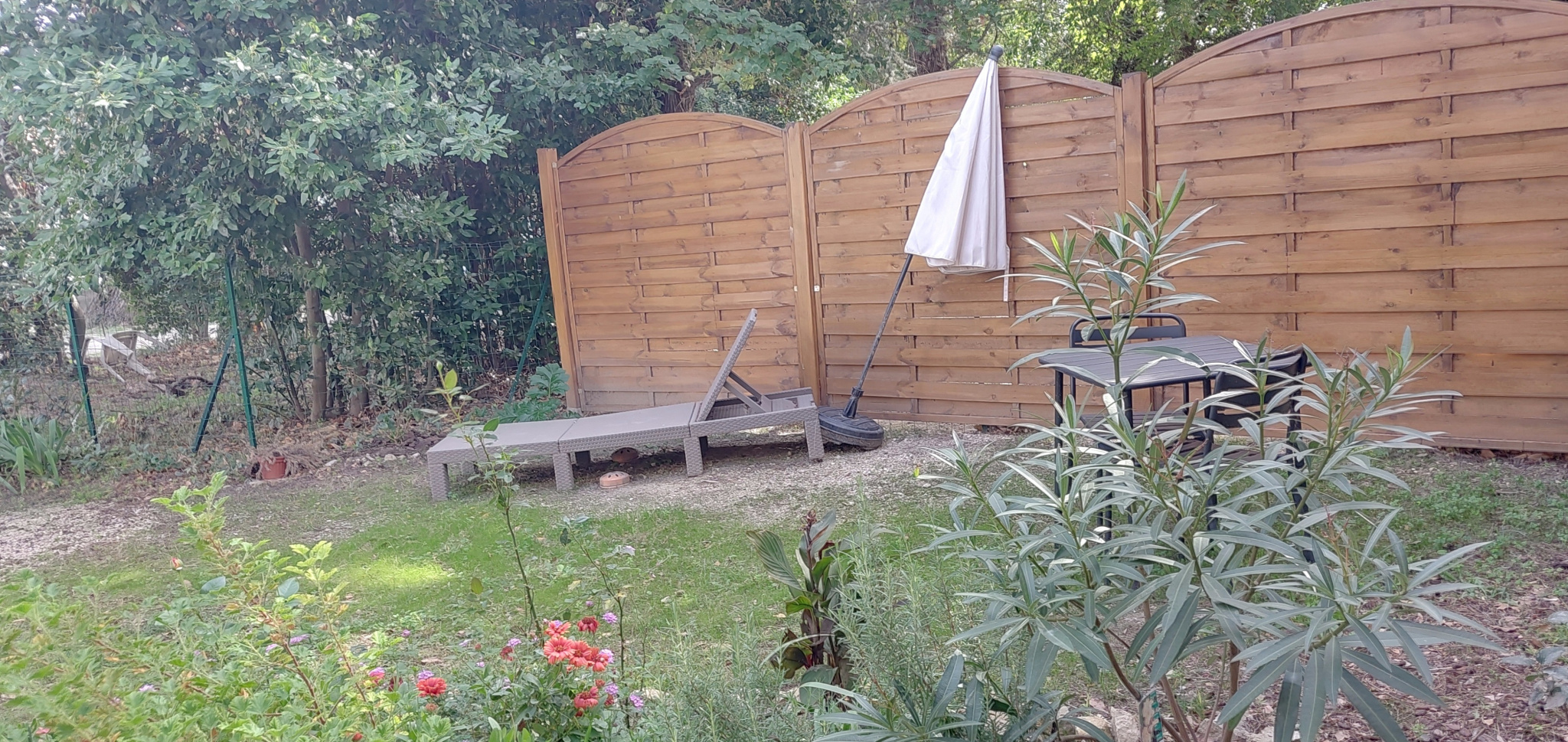 Le jardin est entièrement clos et joliment fleuri, il acceuille un chalet en bois sur dalle en béton d'environ 6 m², qui sera parfait pour entreposer du matériel ou pourra servir de chambre d'appoint.